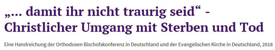 Die EKD und die Orthodoxe Bischofskonferenz in Deutschland haben eine gemeinsame Handreichung zur Seelsorge an Sterbenden und ihren Angehörigen veröffentlicht. Das orthodox-evangelische Papier „...damit ihr nicht traurig seid. Christlicher Umgang mit Sterben und Tod“ steht online zur Verfügung oder kann in kleineren Stückzahlen kostenlos unter versand@ekd.de bestellt werden.