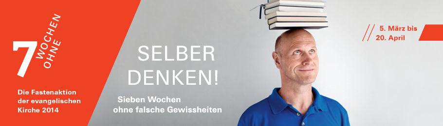 "Selber denken! 7 Wochen ohne falsche Gewissheiten": Unter diesem Motto will "7 Wochen Ohne - die Fastenaktion der evangelischen Kirche" in der Fastenzeit 2014 heraus aus fragloser Routine und halben Wahrheiten locken und zum Nachfragen und Neudenken ermutigen. Mut und eine Portion Unvernunft brauche es, Gewohnheiten und Traditionen infrage zu stellen - im Job, in der Familie oder in der Kirche. Mit Kalendern, Fastenbriefen und einem Themenheft unterstützt die zum Netzwerk des Gemeinschaftswerkes der Evangelischen Publizistik gehörende Aktion die Fastengruppen vor Ort. An "7 Wochen Ohne" beteiligen sich jährlich zwischen Aschermittwoch und Ostern mehr als drei Millionen Menschen.