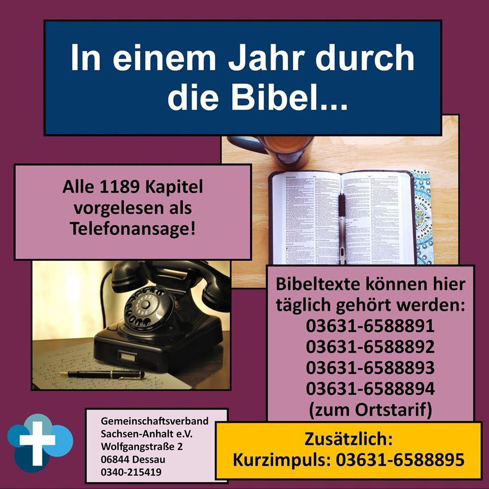 Der Gemeinschaftsverband Sachsen-Anhalt hat eine besondere Bibelleseaktion gestartet. In einem Jahr wird die komplette Bibel vorgelesen und kann per Telefon oder WhatsApp gehört werden. Dies kann eine Alternative sein für Menschen, die nur ein Telefon, aber keinen Computer besitzen.