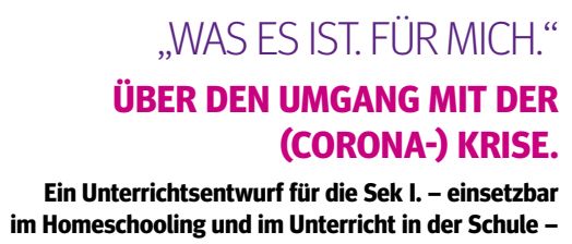 Ausgehend von dem Text "Was es ist. Für mich." von Laura Meemann setzen sich die Schüler*innen mit existentiellen Fragen auseinander, die in Krisenzeiten (z.B. Coronakrise) aufbrechen können, und reflektieren Möglichkeiten, mit diesen Fragen umzugehen. Dabei spielen unterschiedliche Zugänge, wie z.B. Videoclips von Jugendlichen, Aktionen von religiösen Gemeinschaften und unterschiedliche Texte zum Nachdenken eine Rolle.