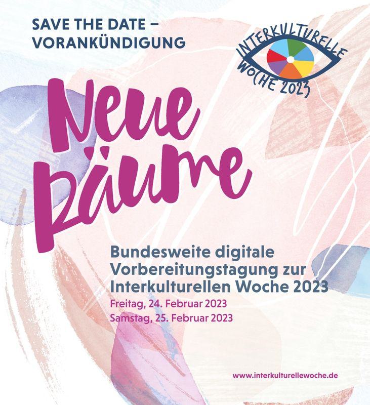 Am 24. und 25. Februar 2023 findet die bundesweite Vorbereitungstagung zur Interkulturellen Woche (IKW) 2023 statt, diesmal unter dem Motto Neue Räume und erneut komplett online. Die Anmeldung ist ab dem 17. Januar 2023 möglich. Das ständig aktualisierte Tagungsprogramm finden Sie hier: https://www.interkulturellewoche.de/