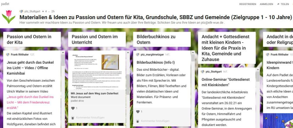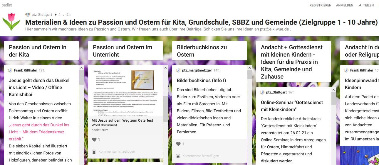 Die Dozent:innen Dr. Sabine Benz, Margit Metzger, Frank Ritthaler und Elke Theurer-Vogt vom Pädagogisch-Theologischen Zentrum Stuttgart haben für Elementarbereich, Grundschule, SBBZ/Inklusion und für Gemeinden Ideen für Ostern für Kinder bis zehn Jahre in einem Padlet gesammelt. “Feste begleiten Kinder durch das Jahr … auch in Zeiten von Corona.