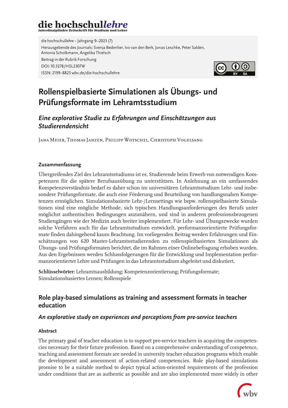 Meier, J., Janzen, T., Wotschel, P. & Vogelsang, C. (2023). Rollenspielbasierte Simulationen als Übungs- und Prüfungsformate im Lehramtsstudium. Eine explorative Studie zu Erfahrungen und Einschätzungen aus Studierendensicht. die hochschullehre, Jahrgang 9/2023. DOI: 10.3278/HSL2307W.