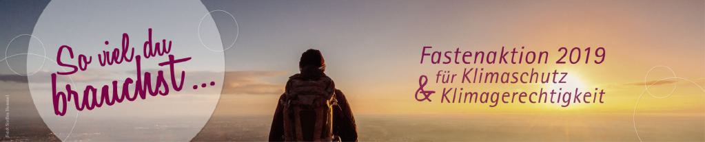 Mit dem biblischen Leitsatz „So viel du brauchst“ regt die Fastenaktion dazu an, sich Zeit zu nehmen, das eigene Handeln im Alltag zu überdenken, Neues auszuprobieren, etwas zu verändern. Klimaschutz und Klimagerechtigkeit stehen im Mittelpunkt der Fastenzeit. Von Aschermittwoch (6. März 2019) bis Ostersonntag (21. April 2019) geht es zum Beispiel darum, achtsamer zu kochen, anders unterwegs zu sein oder Orte der Einkehr und Ruhe aufzusuchen.
