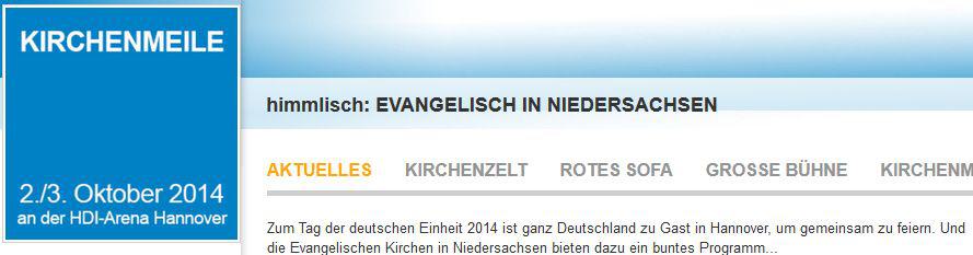 Unter dem Motto "himmlisch: evangelisch in Niedersachsen" beteiligen sich die fünf evangelischen Kirchen in Niedersachsen am Bürgerfest zum diesjährigen Tag der Deutschen Einheit am 2. und 3. Oktober in Hannover. Sie präsentieren in Zelten am Arthur-Menge-Ufer und auf der Bühne vor der HDI-Arena ein gemeinsames Programm mit Informationen, Musik und Show.