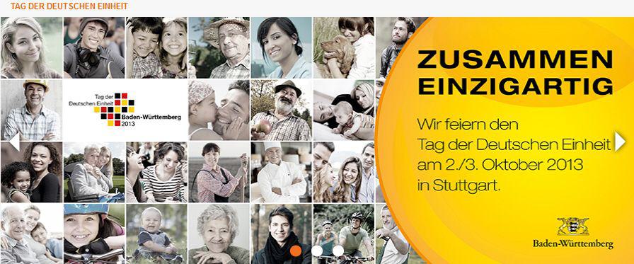 Die offizielle Feier zum Tag der Deutschen Einheit findet seit 1990 in einer Großstadt - meist der Landeshauptstadt - jenes Bundeslandes statt, das zu diesem Zeitpunkt den Vorsitz im Bundesrat innehat. Jedes Jahr stellt ein anderes Land den Vorsitzenden. Seit dem 1. November 2012 ist der baden-württembergische Ministerpräsident Winfried Kretschmann an der Spitze des Bundesrates und daher Baden-Württemberg Gastgeber des Tags der Deutschen Einheit 2013.