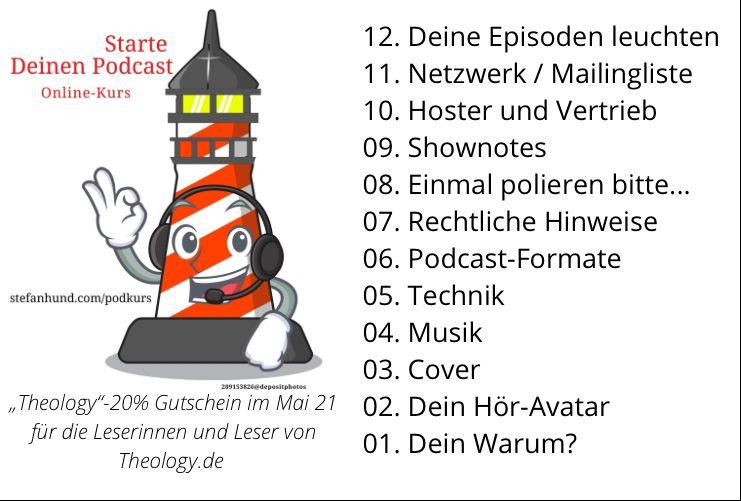 Wie das funktioniert, zeigt Stefan Hund erfahrener Podcaster und Fachbuchautor mit dem Bild eines Podcastleuchtturms. Zuerst begleitet er seine Teilnehmer ausführlich beim Gießen des Fundamentes: Die ersten beiden Kapitel heißen daher: Was ist Dein Warum? Wer ist Dein Hörer? - Dann geht es ausführlich - auch mit Videos, um die Technik, das Cover und die Musik. Rechtliche Themen werden genauso angesprochen, wie die Frage nach dem Hosting und dem Ausliefern an die Hörgemeinde. Nicht zuletzt spricht er über den Aufbau von Email-Listen, mit denen er seine Hörer unabhängig von Social Media erreicht - und das auch noch ganz legal. Und dann geht es an die Veröffentlichung der ersten Episoden.