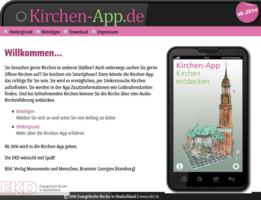 Sie wird es ermöglichen, per Umkreissuche Kirchen aufzufinden. Sie werden in der App Zusatzinformationen wie Gottesdienstzeiten finden. Und bei teilnehmenden Kirchen können Sie die Kirche über eine Audio-Kirchenführung entdecken.