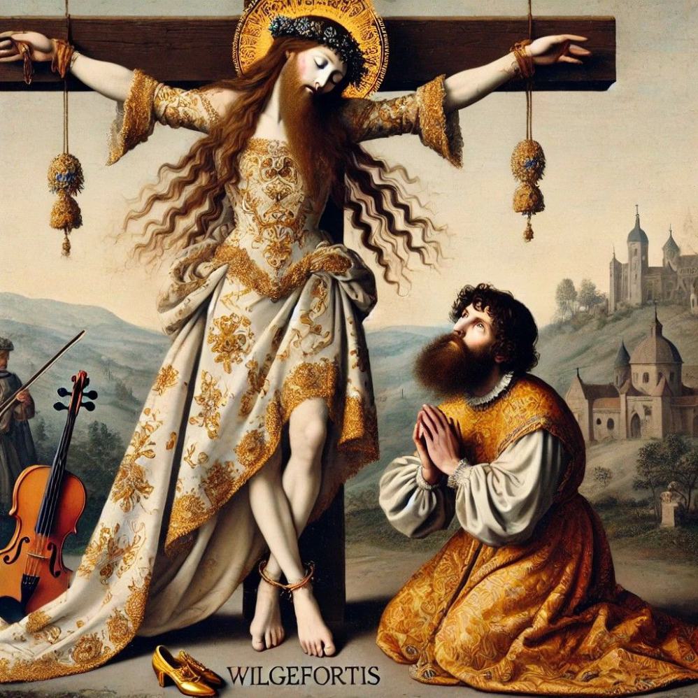 Der Name Wilgefortis steht im Althochdeutschen für "starker Wille" oder im Lateinischen für "starke Jungfrau". Erstmals im 15. Jahrhundert in den Niederlanden bezeugt, erzählt die Legende von einer schönen und tugendhaften Königstochter aus Lusitanien, dem heutigen Portugal. Ihr Vater wollte sie mit einem heidnischen Prinzen vermählen, doch Wilgefortis hatte sich Christus als ewiger Jungfrau geweiht.