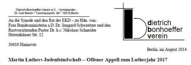 Denn für uns gehört ein deutliches Wort der Distanzierung von Martin Luthers Judenfeindschaft unabdingbar zum Reformationsjubiläum. Ohne einen solchen Akt können wir uns im Dietrich-Bonhoeffer-Verein e.V. nicht vorstellen, das Jubiläum recht mitzufeiern.