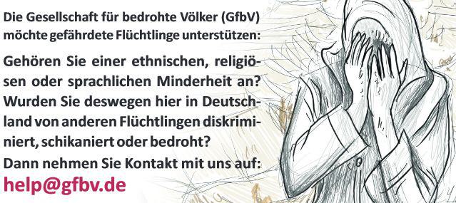 Gefährdete Flüchtlinge können sich in Zukunft an die Gesellschaft für bedrohte Völker (GfbV) wenden. Diese hat unter der Mailadresse help@gfbv.de einen „Notruf“ eingerichtet. Unter den Flüchtlingen, die Deutschland beherbergt, sind Angehörige unterschiedlicher Minderheiten. In ihren Herkunftsländern wurden manche von ihnen – gerade weil sie nicht zur ethnischen oder religiösen Mehrheit gehörten – Opfer schwerster Gewalt, Verfolgung und Diskriminierung. Hier versuch die GfbV zu helfen.